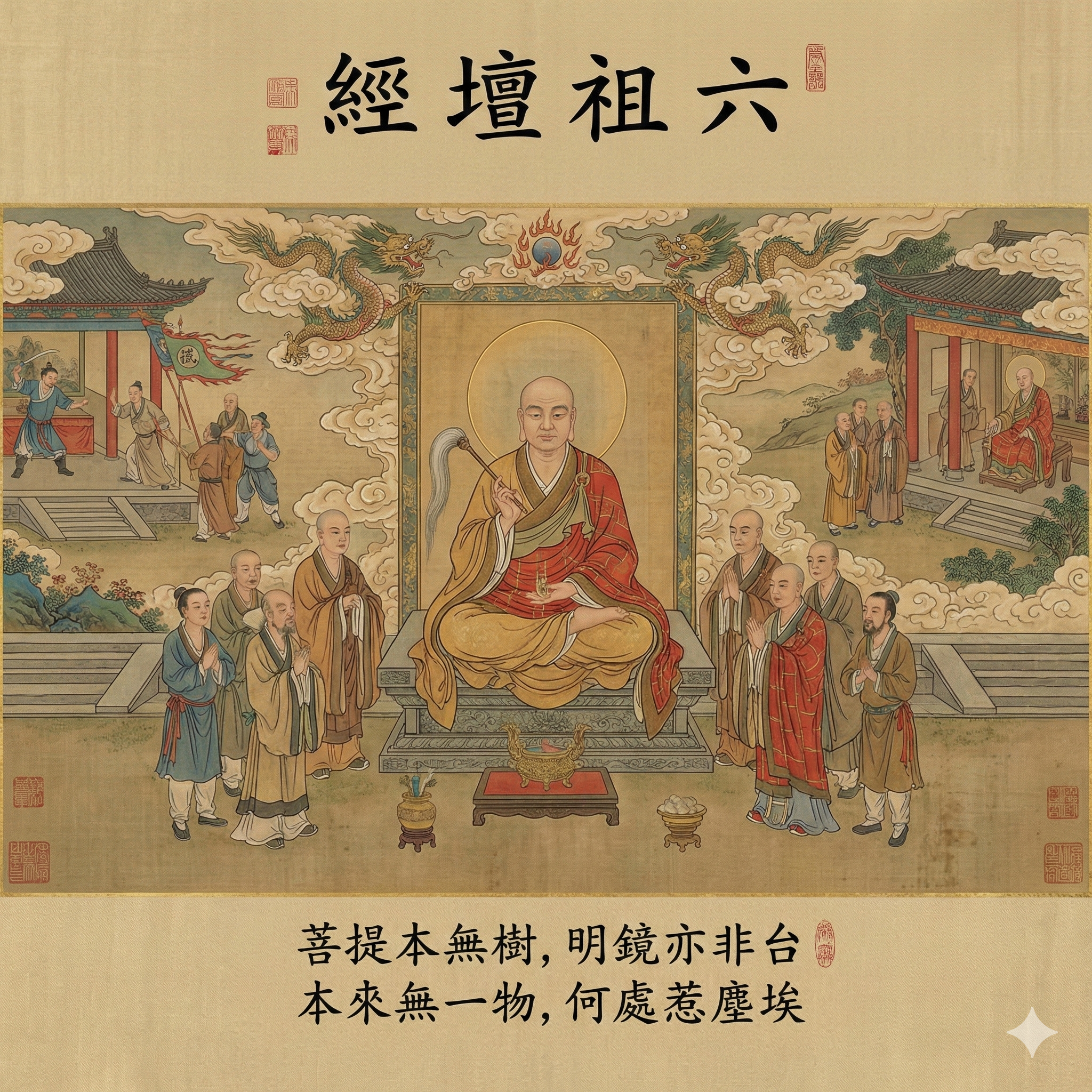 印宗悟契師旨。是月十五日、普會四眾、為師薙髮。二月八日、集諸名德、授具足戒。西京智光律師為授戒師。蘇州。慧靜律師為羯磨。荊州通應律師為教授。中天耆多羅律師為說戒。西國蜜多三藏為證戒。其戒壇。乃宋朝求那跋陀羅三藏創建。立碑曰、後當有肉身菩薩於此受戒。又、梁天監元年、智藥三藏自西竺國航海而來。將彼土菩提樹一株、植此壇畔。亦預誌曰、後一百七十年、有肉身菩薩於此樹下開演上乘、度無量眾。真傳佛心印之法主也。師至是祝髮受戒。及與四眾開示單傳之法旨、一如昔讖。次年春、師辭眾歸寶林。印宗與緇白、送者千餘人、直至曹溪。時荊州通應律師、與學者數百人、依師而住。師至曹溪寶林。觀堂宇湫隘、不足容眾、欲廣之。遂謁里人陳亞仙曰、老僧欲就檀越求坐具地、得不。仙曰、和尚坐具幾許闊。祖出坐具示之。亞仙唯然。師以坐具一展。盡罩曹溪四境。四天王現身、坐鎮四方。今寺四境有天王嶺。因茲而名。仙曰、知和尚法力廣大。但吾高祖墳墓並坐此地。他日造塔、幸望存留、餘願盡捨永為寶坊。然此地乃生龍白象來脈、只可平天不可平地。寺後營建。一依其言。師遊境內、山水勝處。輒憩止。遂成蘭若一十三所。今日花果院。隸藉寺門。其寶林道場、亦先是西國智藥三藏。自南海經曹溪口。掬水而飲。香美。異之。謂其徒曰、此水與西天之水無別、溪源上必有勝地、堪為蘭若、隨流至源上、四顧山水回環。峰巒其秀。歎曰、宛如西天寶林山也。乃謂曹侯村居民曰、可於此山建一梵剎、一百七十年後當有無上法寶、於此演化、得道者如林、宜號寶林。時韶州牧侯敬中。以其言具表聞奏。上可其請。賜額為寶林。遂成梵宮。蓋始於梁天監三年也。寺殿前有潭一所。龍常出沒其間。觸撓林木。一日、現形甚巨。波浪洶湧、雲霧陰翳。徒眾皆懼。師叱之曰、你只能現大身、不能現小身。若為神龍、當能變化、以小現大。以大現小也。其龍忽沒。俄頃復現小身。躍出潭面。師展鉢試之、曰、你且不敢入老僧鉢盂裡。龍乃游揚至前。師以鉢舀之。龍不能動。師持鉢歸堂上。與龍說法。龍遂蛻骨而去。其骨長可七寸。首尾角足皆具。留傳寺門。師後以土石堙其潭。今殿前左側、有鐵塔處是也。